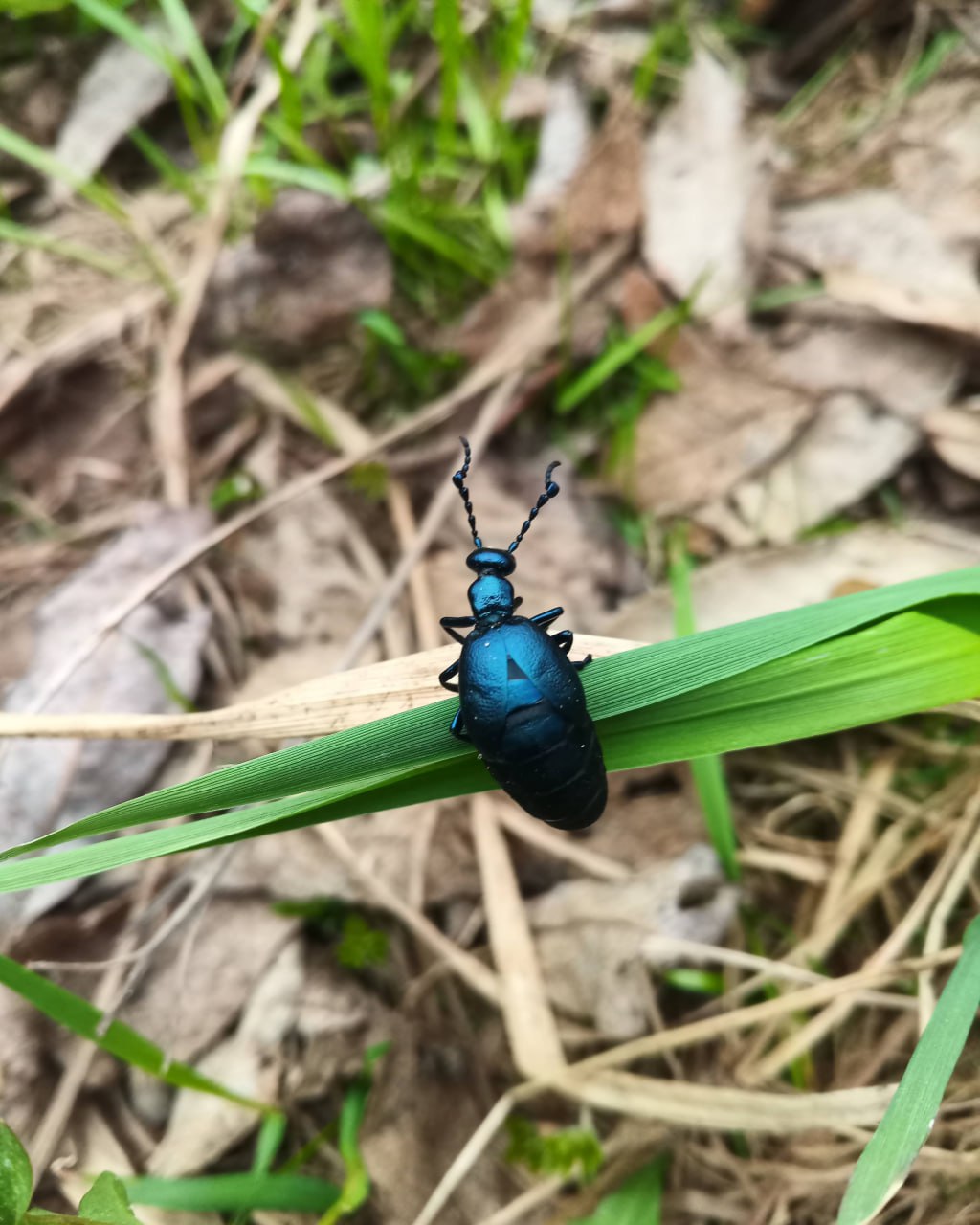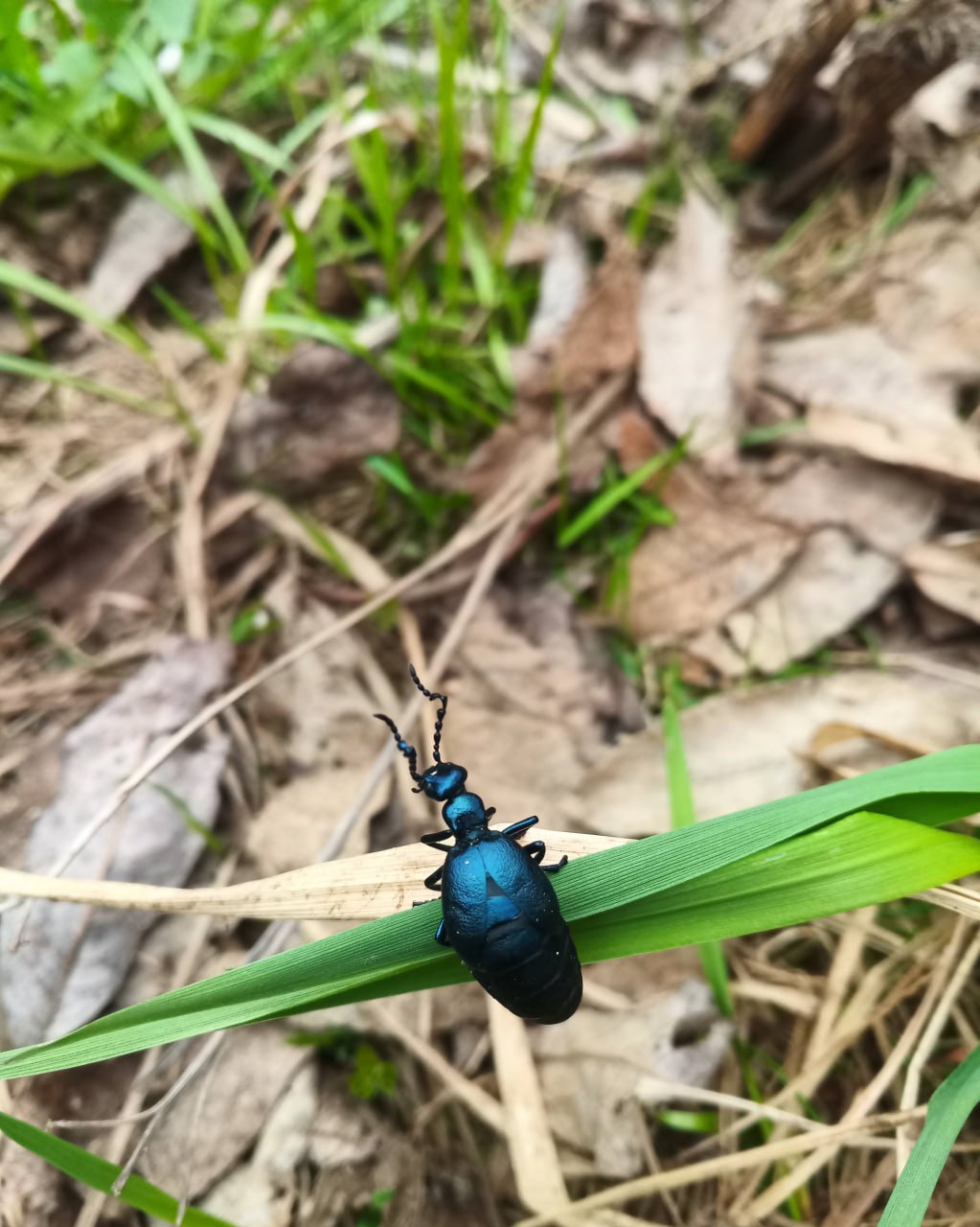 Это достаточно крупный жук. Длина тела - примерно 3 см. Туловище отливает металлической синевой. Специалисты Мосприроды просят не брать его в руки, жучок очень хрупок.